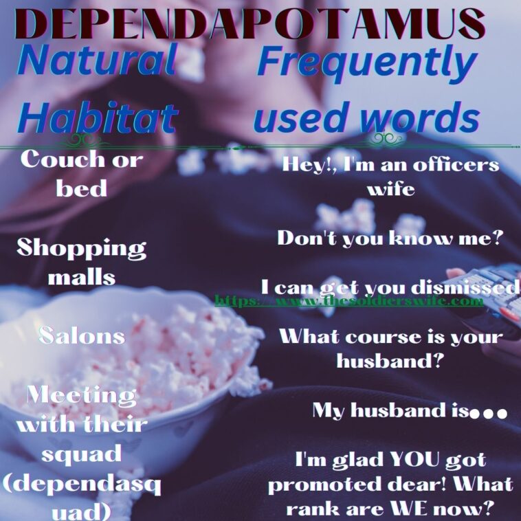 By the way, the tradition is often a sign of courtesy to the spouses; however, some spouses, especially the wives, take the joke to the extreme and see themselves as wearing the imaginary ranks and hence do not want to engage in any form of productive lifestyle other than to lord the husbands ranks in the face of WHOEVER cares and wait for the service member’s salary and allowances. Those are the wives I call the DEPENDAPOTAMUS.