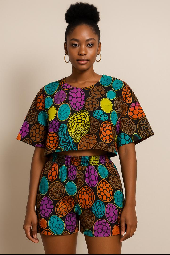 • Two-piece set: short-sleeved crop top + high-waist shorts